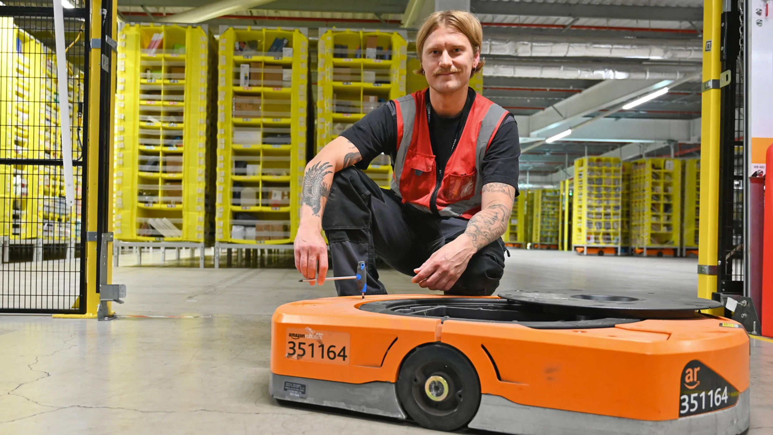 A reliability maintenance engineering technician at an Amazon fulfilment centre in Bristol, UK.