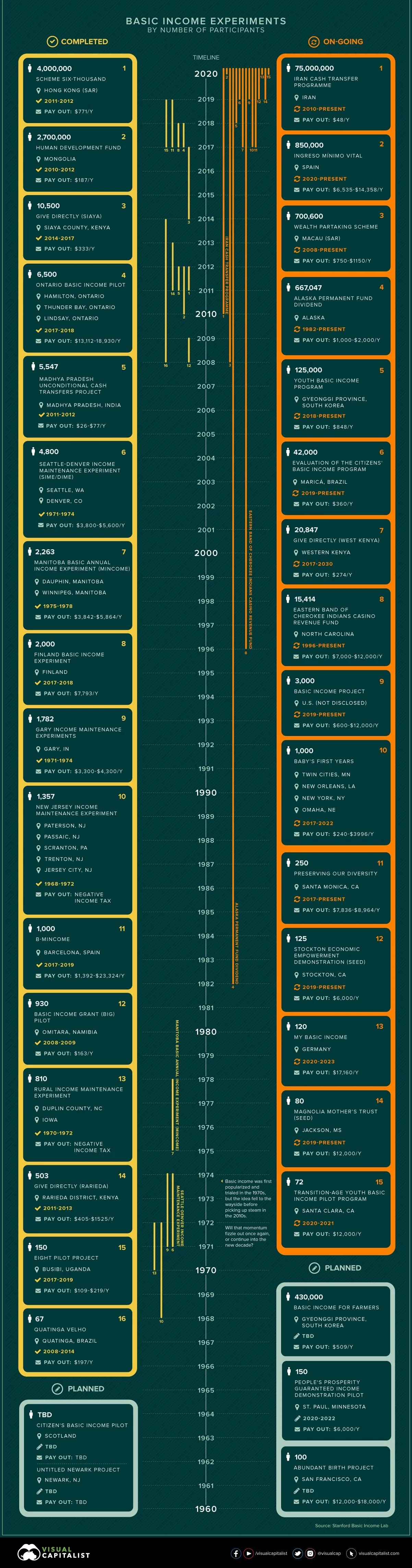 Figure 2. Timeline of UBI pilots (1960–2020) based on Stanford Basic Income Lab data—from Alaska’s dividend to Iran, Finland, and Kenya—showing that the payout infrastructure already exists, a useful precedent for routing future space resource and energy royalties to citizens.